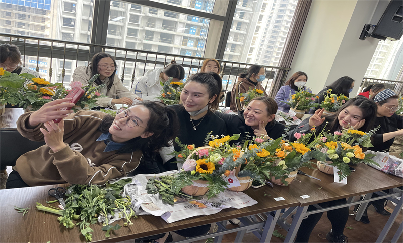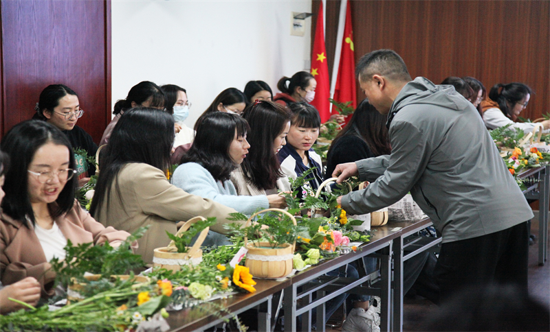 在花藝?yán)蠋煹南ば闹笇?dǎo)下,女同志們迫不及待開(kāi)始了插花,忙得不亦樂(lè)乎。她們用心構(gòu)思、精心創(chuàng)作,在顏色、角度、層次等方面不斷嘗試,將不同的花材錯(cuò)落有致地搭配在一起,再以滿天星精心點(diǎn)綴,添加綠色枝葉作為襯托,隨后,一簇簇美麗別致、層次豐富的花卉在花籃上悄然綻放。