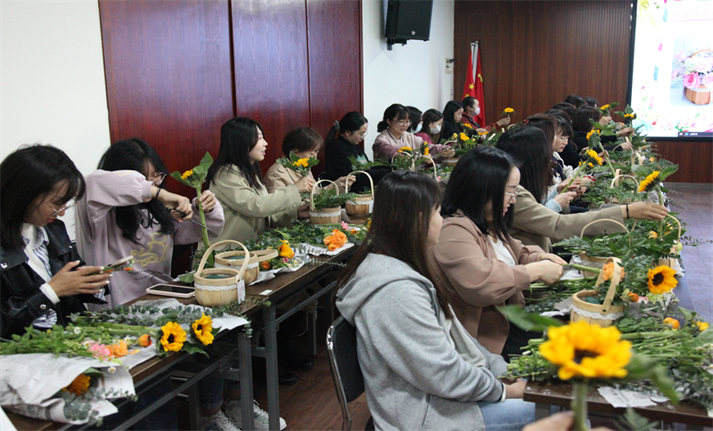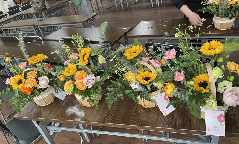 潔白無(wú)瑕的白桔梗,清新淡雅的康乃馨,濃烈徇爛的紅玫瑰,金色活潑的向日葵......一束束色彩斑斕的鮮花整齊有序地?cái)[放在桌面上,拉開(kāi)了插花活動(dòng)的帷幕。