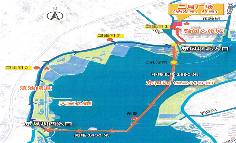 其中我公司參建項目——東風壩全長450米,而在東風壩中段,與后海濕地之間,架設(shè)著一座可移動式鋼浮橋,浮橋全長140米,寬4米,拱橋最高為3.5米,設(shè)計立意來源于昆明古八景之一“云津夜市”。通過其建設(shè)還原“云津橋上望,燈火萬千家”的熱鬧場景。